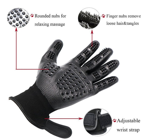 including horses, to detangle and softly remove shedding hair. The gloves are